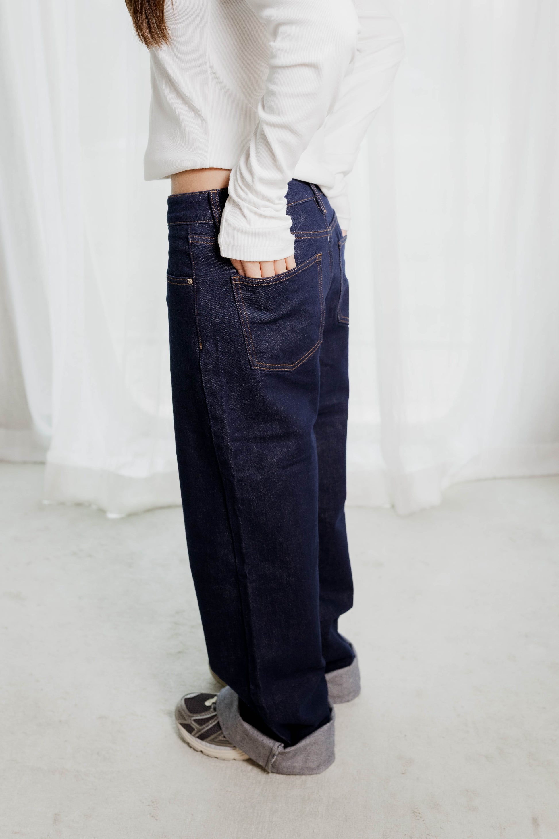Le Rosa est le jean droit intemporel, revisité dans un bleu brut profond. Sa ligne parfaitement équilibrée élance la silhouette et traverse les saisons sans se démoder. Un allié du quotidien, facile à associer avec un blazer ou une chemise oversize.